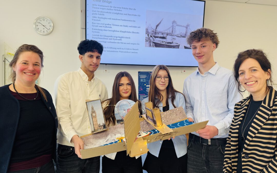 Beispielhaft dafür stehen Hadi, Jasmina, Max und Stejsi, die sich im Rahmen ihres Projekts mit Sehenswürdigkeiten in London auseinandergesetzt haben. Mit einer gedanklichen Bootsfahrt über die Themse führten sie die Kommission mit Schulleiterin Anna Reimann und Fachprüferin Victoria Ternes anschaulich und fachlich fundiert durch ihre Ergebnisse.
