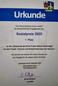 Die Klasse 8a der Anne-Frank-Schule hat beim diesjährigen Sozialpreis des Werra-Meißner-Kreises den ersten Platz erreicht. Für ihr Inklusionsprojekt „Chancen und Herausforderungen von Inklusion“ erhielt die Klasse die höchste Auszeichnung sowie ein Preisgeld von 1.000 Euro. Vorgeschlagen wurde das Projekt von der ehemaligen Schulleiterin Kerstin Ihde.